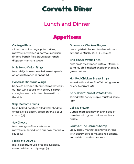 The menu at Corvette Diner is a treasure trove for those who appreciate classic American comfort food. Start with the Garbage Plate slider trio or the Hula Hoop Onion Rings—deliciously fresh, house-breaded sweet Spanish onions paired with rich ranch dipping sauce. For something heartier, dive into their signature sandwiches like the All American Dip, featuring tender, house-made roast beef loaded with caramelized onions and melted Monterey Jack cheese. Or perhaps savor the B.L.A.S.T.—a marvelous combination of crispy bacon, fresh guacamole, and luscious turkey, all layered on toasted sourdough bread. The array of options is extensive and caters to every taste—making every visit an adventure in flavor!